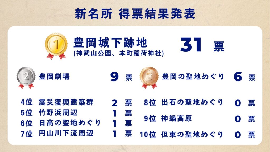 1位:豊岡城下跡地(神武山公園 / 本町稲荷神社)31票6位:日高の聖地めぐり